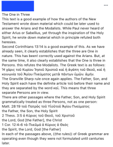 Recently, someone on a Facebook group I am in tried to use a particular rule of Greek grammar (known as Sharp’s sixth rule) to prove that 2 Corinthians 13:14 and Matthew 28:19 teach the Trinity doctrine. His explanation sounds convincing if you don’t know Greek; but when you know Greek, you realize that things are not as simple as our Greek-y Trinitarian would have us believe. I will post a screenshot of his Facebook post below, and then I will work through my response.